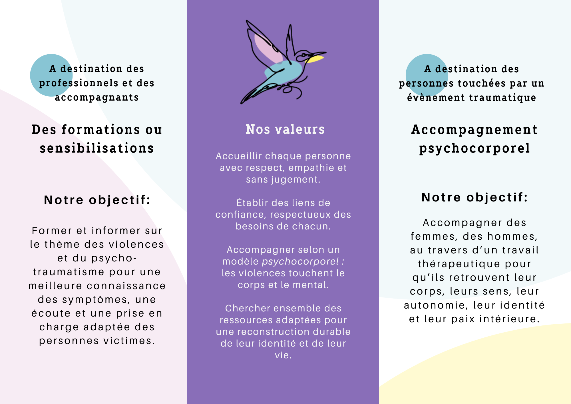Le but de l’association est de vous accompagner en thérapie psycho-corporelle et/ou en formation dans le cadre de psycho-traumatismes tels que les violence(s) psychologiques, physiques ou sexuelles. Les tarifs des accompagnements thérapeutiques sont adaptatifs.